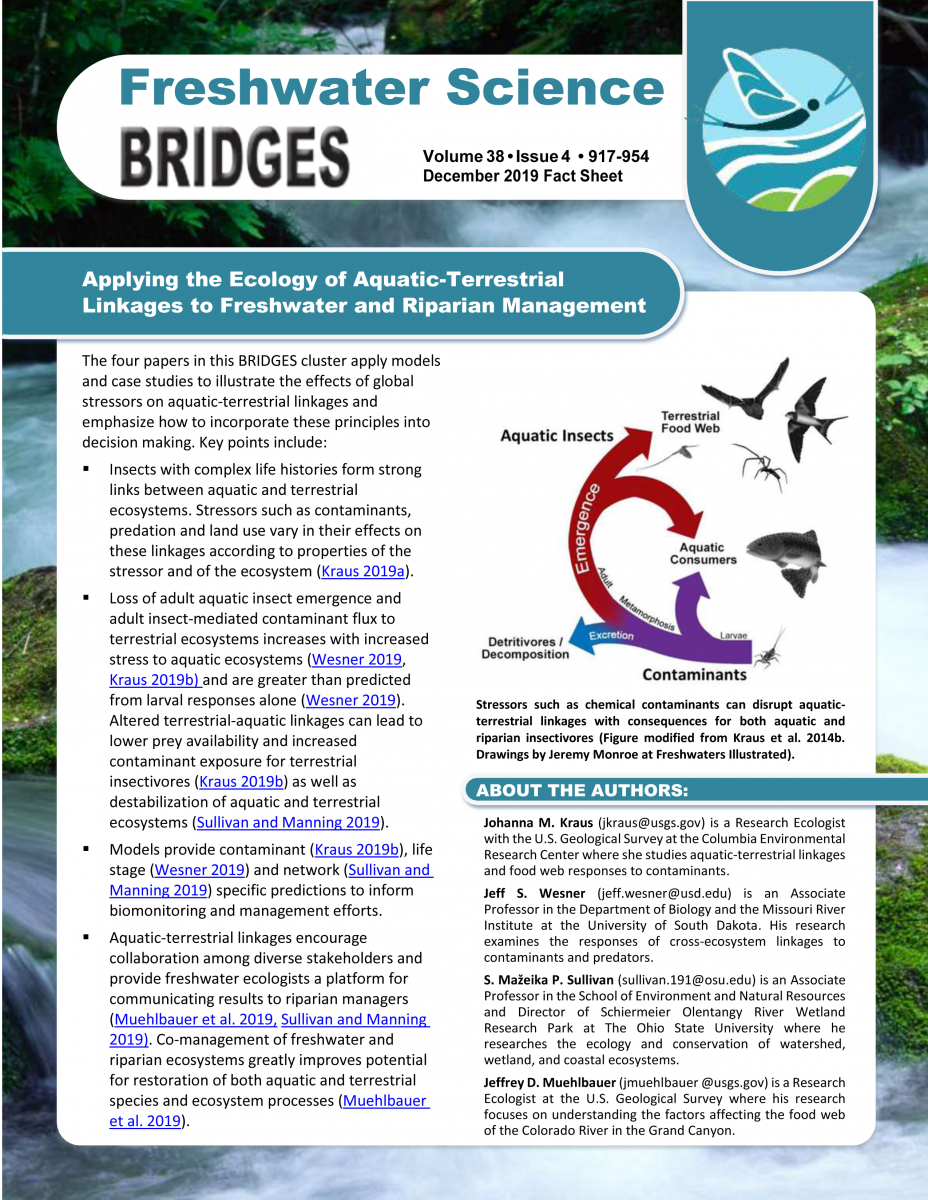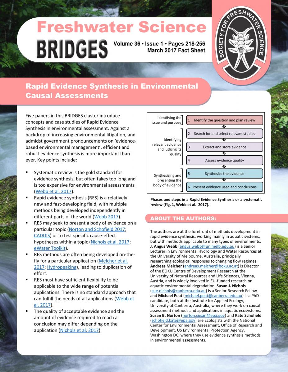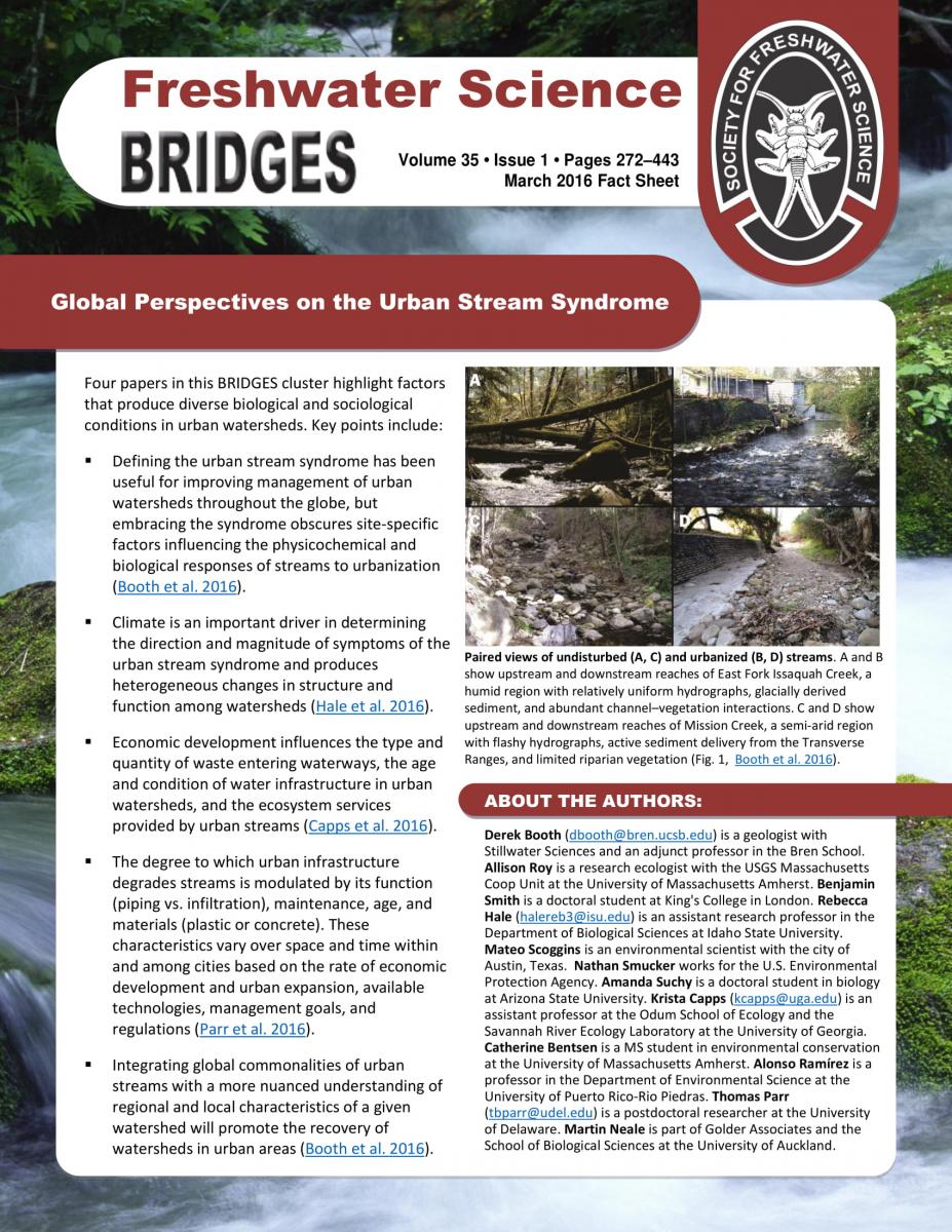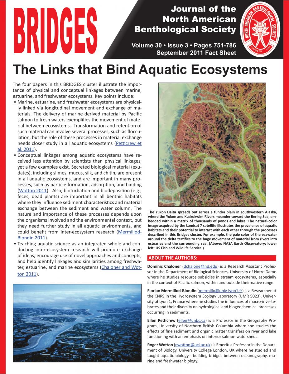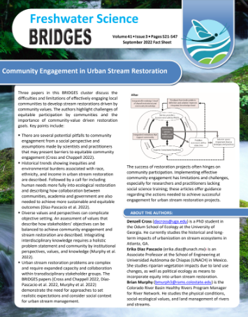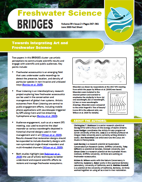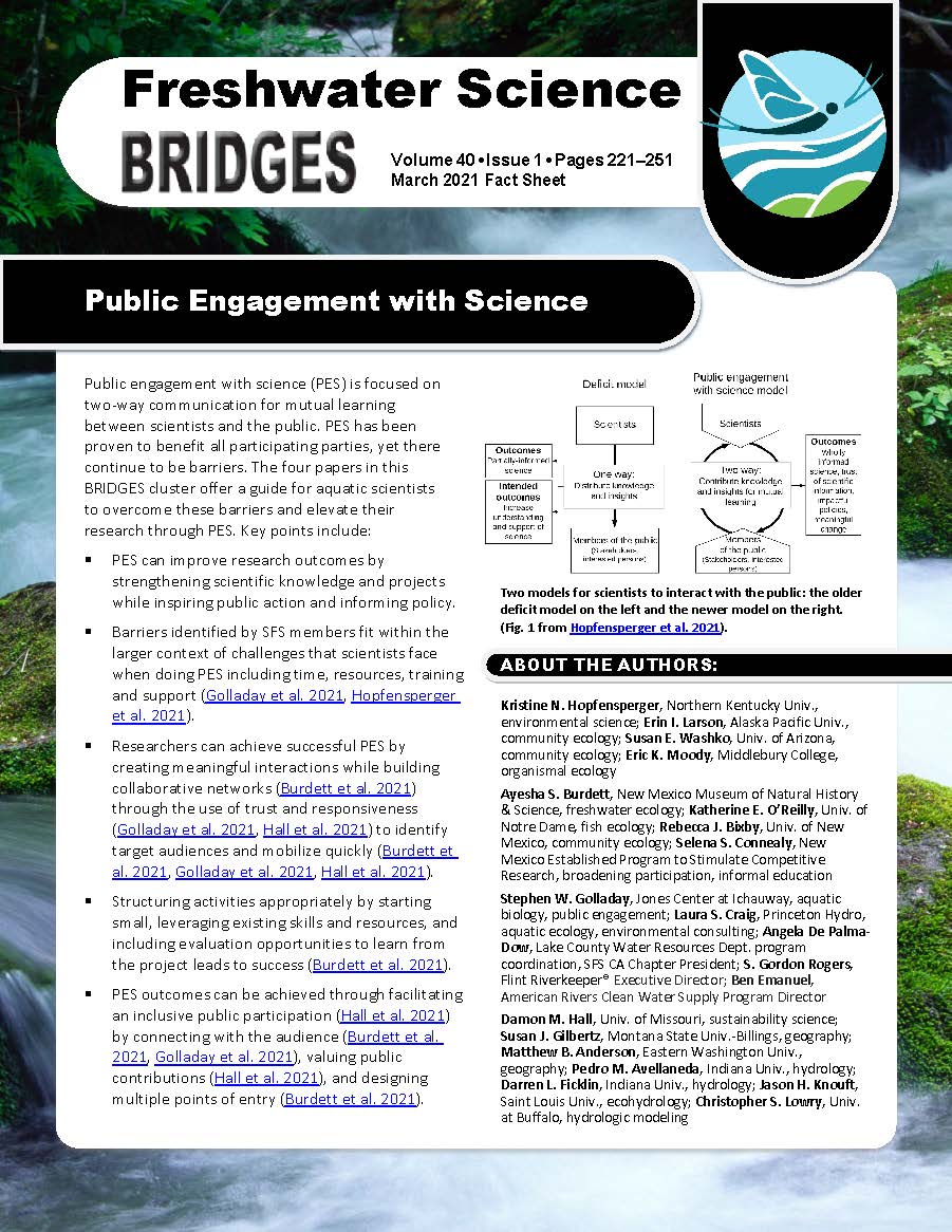 Freshwater Science BRIDGES issues are published about once a year and are comprised of a cluster of short articles offering different perspectives within a topic area. BRIDGES fact sheets highlight the main points of each BRIDGES cluster using non-technical language to aid in the accessibility of BRIDGES issues.