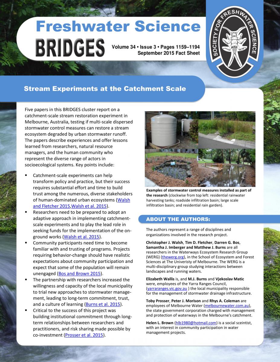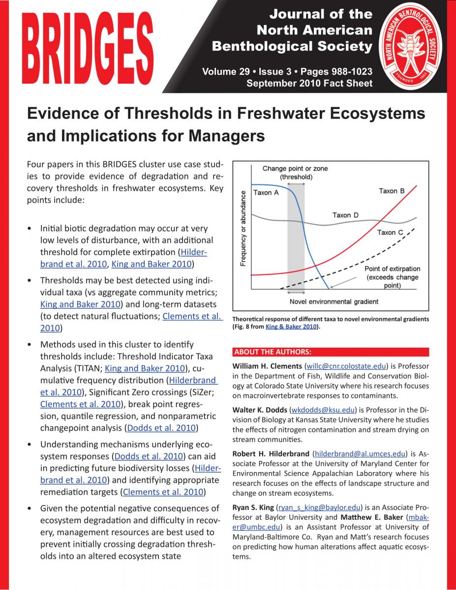 BRIDGES is a forum for contrasting or complementary perspectives on new and emerging ideas in aquatic science. Clusters of short articles offering different perspectives within a topic area are welcome. Topics that build across disciplines are preferred, e.g., integrating public policy and science, improving communication among scientists and other communities, or linking scientific disciplines. BRIDGES fact sheets highlight the main points of each BRIDGES cluster using non-technical language to aid in the accessibility of BRIDGES issues. Authors or guest editors with ideas for topics should contact BRIDGES Editors, Todd Royer (troyer@indiana.edu) or Krista Capps (kcapps@uga.edu).